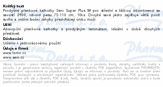 Prodyšné plenkové kalhotky Seni Super Plus M pro střední a těžkou inkontinenci se savostí 2900, obvod pasu 75-110 cm, 10ks. Dvojité savé jádro zajišťuje větší pocit sucha a vnitřní boční záhyby předcházejí úniku moči.Použití