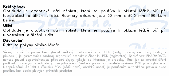 Opticlude je ortoptická oční náplast, která se používá k okluzní léčbě očí při tupozrakosti a šilhání u dětí. Rozměry okluzoru jsou 50 mm x 60, 5 mm. 100 ks v balení.Použití