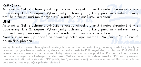Actolind w Gel je ochranný zvlhčující a ošetřující gel pro akutní nebo chronické rány a popáleniny 1. a 2. stupně. Vytváří tenký ochranný film, který přispívá k zotavení rány tím, že brání přilnutí mikroorganismů a udržuje oblast čistou a vlhkou.Použití
