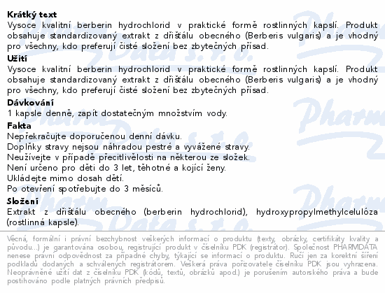 Vysoce kvalitní berberin hydrochlorid v praktické formě rostlinných kapslí. Produkt obsahuje standardizovaný extrakt z dřišťálu obecného (Berberis vulgaris) a je vhodný pro všechny, kdo preferují čisté složení bez zbytečných přísad.Použití