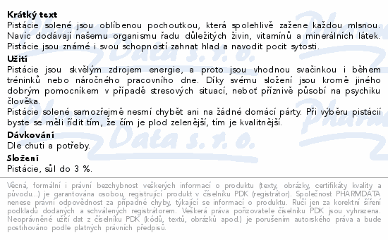 Pistácie solené jsou oblíbenou pochoutkou, která spolehlivě zažene každou mlsnou. Navíc dodávají našemu organismu řadu důležitých živin, vitamínů a minerálních látek. Pistácie jsou známé i svou schopností zahnat hlad a navodit pocit sytosti.Použití