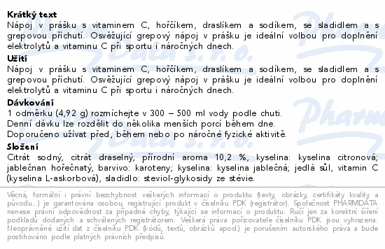 Nápoj v prášku s vitaminem C, hořčíkem, draslíkem a sodíkem, se sladidlem a s grepovou příchutí. Osvěžující grepový nápoj v prášku je ideální volbou pro doplnění elektrolytů a vitaminu C při sportu i náročných dnech.Použití
