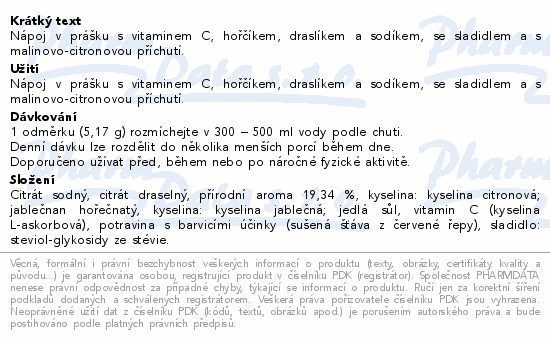 Nápoj v prášku s vitaminem C, hořčíkem, draslíkem a sodíkem, se sladidlem a s malinovo-citronovou příchutí.Použití