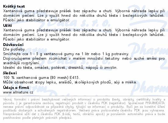 Xantanová guma představuje prášek bez zápachu a chuti. Výborná náhrada lepku při domácím pečení. Lze ji využít hned do několika druhů těsta i bezlepkových lahůdek. Působí jako stabilizátor a emulgátor.Použití