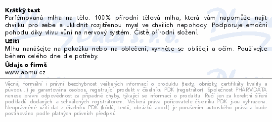 Parfémovaná mlha na tělo. 100% přírodní tělová mlha, která vám napomůže najít chvilku pro sebe a uklidnit rozjitřenou mysl ve chvílích nepohody. Podporuje emoční pohodu díky vlivu vůní na nervový systém. Čistě přírodní složení.Použití