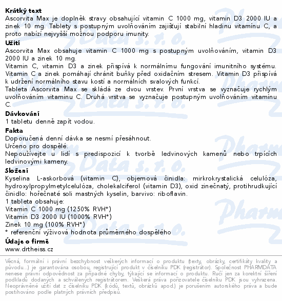 Ascorvita Max je doplněk stravy obsahující vitamin C 1000 mg, vitamin D3 2000 IU a zinek 10 mg. Tablety s postupným uvolňováním zajišťují stabilní hladinu vitamínu C, a proto nabízí nejvyšší možnou podporu imunity.Použití