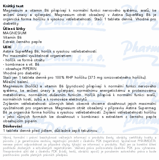 Magnesium a vitamin B6 přispívají k normální funkci nervového systému, svalů, ke snížení únavy a vyčerpání. Magnesium citrát obsažený v Astina SuperMag B6 je organická forma hořčíku s vysokou vstřebatelností. Stačí 1 tableta denně. Vhodné pro diabetiky.Použití