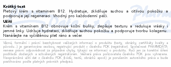 Pleťový krém s vitaminem B12. Hydratuje, zklidňuje suchou a citlivou pokožku a podporuje její regeneraci. Vhodný pro každodenní péči.Použití