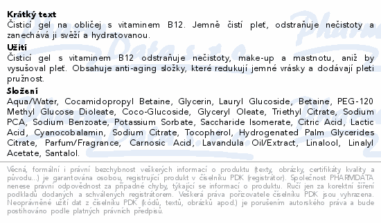 Čisticí gel na obličej s vitaminem B12. Jemně čistí pleť, odstraňuje nečistoty a zanechává ji svěží a hydratovanou.Použití