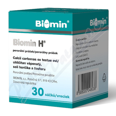 Biomin H slouží k léčbě a prevenci nedostatku vápníku. Jeden sáček t.j. 3g obsahuje kalcium 1110mg, magnesium 15 mg, fosfor 1, 8mg a mikroelementy. Vyrobeno z vaječných skořápek. Výdej je možný bez lékařského předpisu. Čtěte pozorně příbalový leták.Použití