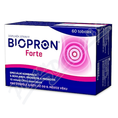 BIOPRON Forte obsahuje speciální kombinaci probiotických bakterií (Lactobacillus acidophilus, Lactobacillus rhamnosus) a probiotických kvasinek Saccharomyces boulardii doplněnou o prebiotické fruktooligosacharidy.Použití