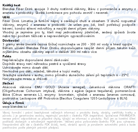 Blendea Fiber Drink spojuje 3 druhy rostlinné vlákniny, šťávu z pomeranče a enzymy z ananasu s probiotiky. Skvělá kombinace pro pohodu zevnitř i navenek.Použití