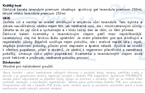Dárková kazeta levandule premium obsahuje: sprchový gel levandule premium 250ml, tělové mléko levandule premium 250ml.Použití