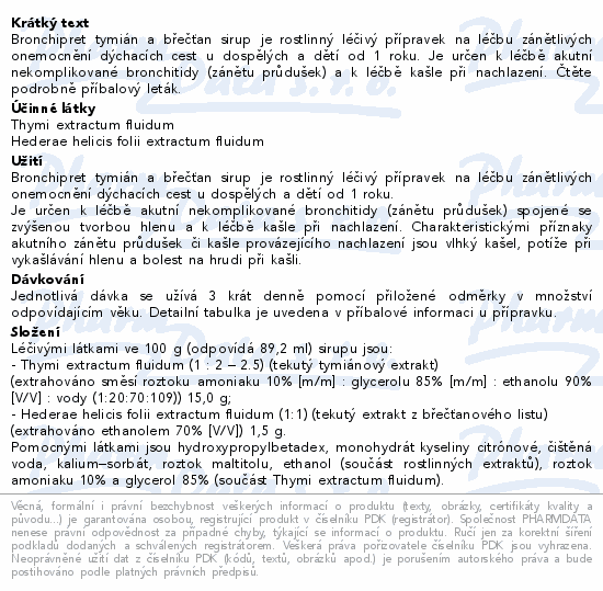 Bronchipret tymián a břečťan sirup je rostlinný léčivý přípravek na léčbu zánětlivých onemocnění dýchacích cest u dospělých a dětí od 1 roku. Je určen k léčbě akutní nekomplikované bronchitidy (zánětu průdušek) a k léčbě kašle při nachlazení. Čtěte pozorně příbalový leták.Použití