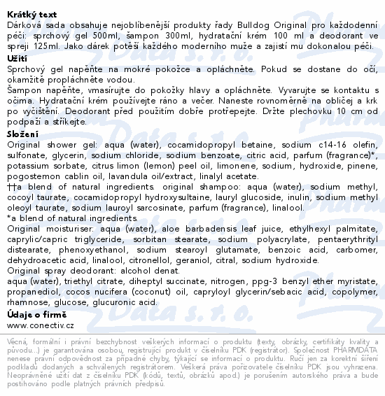 Dárková sada obsahuje nejoblíbenější produkty řady Bulldog Original pro každodenní péči: sprchový gel 500ml, šampon 300ml, hydratační krém 100 ml a deodorant ve spreji 125ml. Jako dárek potěší každého moderního muže a zajistí mu dokonalou péči.Použití