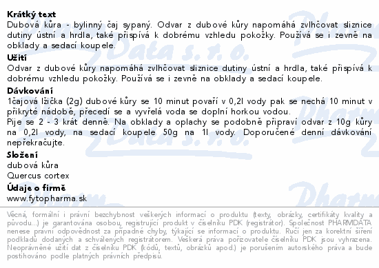 Dubová kůra - bylinný čaj sypaný. Odvar z dubové kůry napomáhá zvlhčovat sliznice dutiny ústní a hrdla, také přispívá k dobrému vzhledu pokožky. Používá se i zevně na obklady a sedací koupele.Použití