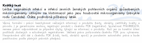 Léčba vaginálních infekcí a infekcí zevních ženských pohlavních orgánů způsobených mikroorganismy citlivými na klotrimazol jako jsou houbovité mikroorganismy (obvykle rodu Candida). Čtěte pozorně příbalový leták.Použití