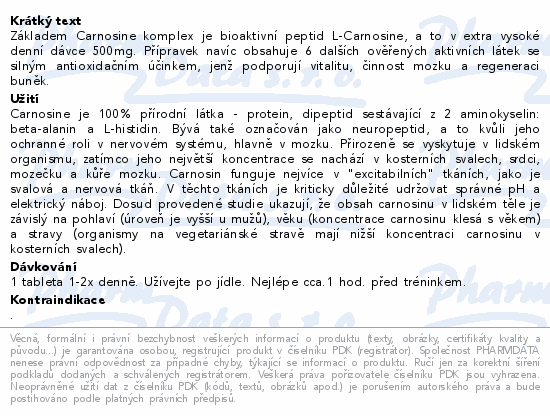 Základem Carnosine komplex je bioaktivní peptid L-Carnosine, a to v extra vysoké denní dávce 500mg. Přípravek navíc obsahuje 6 dalších ověřených aktivních látek se silným antioxidačním účinkem, jenž podporují vitalitu, činnost mozku a regeneraci buněk.Použití