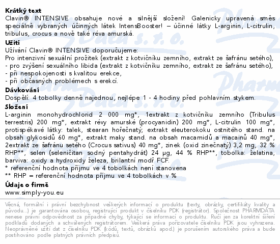 Clavin® INTENSIVE obsahuje nové a silnější složení! Galenicky upravená směs speciálně vybraných účinných látek IntensBooster! – účinné látky L-arginin, L-citrulin, tribulus, crocus a nově také réva amurská.Použití