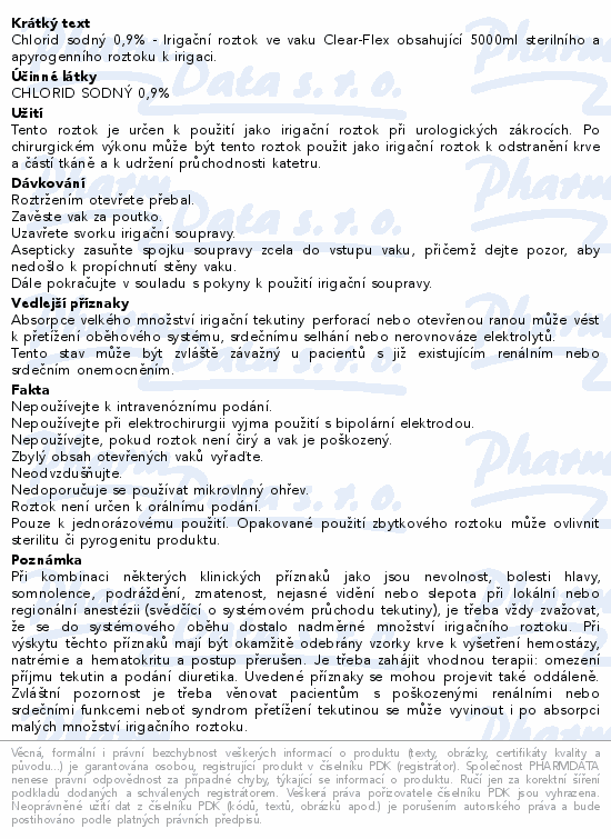 Chlorid sodný 0, 9% - Irigační roztok ve vaku Clear-Flex obsahující 5000ml sterilního a apyrogenního roztoku k irigaci.Použití