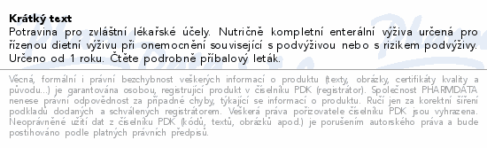 Potravina pro zvláštní lékařské účely. Nutričně kompletní enterální výživa určená pro řízenou dietní výživu při onemocnění související s podvýživou nebo s rizikem podvýživy. Určeno od 1 roku. Čtěte pozorně příbalový leták.Použití
