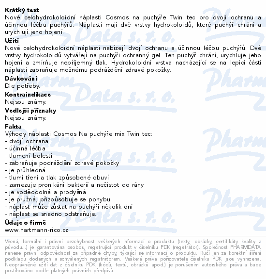 Nové celohydrokoloidní náplasti Cosmos na puchýře Twin tec pro dvojí ochranu a účinnou léčbu puchýřů. Náplasti mají dvě vrstvy hydrokoloidů, které puchýř chrání a urychlují jeho hojení.Použití
