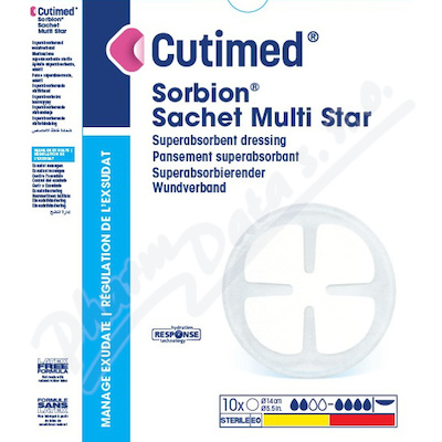 Cutimed Sorbion Sachet Multistar je sterilní, hydroaktivní krytí na rány, které tvoří gel a silně absorbuje exsudáty. Krytí do svého superabsorpčního jádra absorbuje exsudát z rány a spolehlivě jej zadržuje i při kompresi.Použití