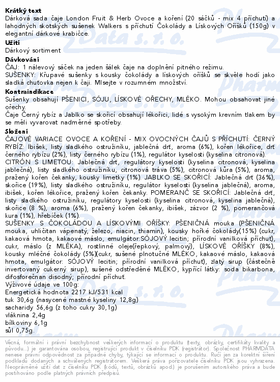 Dárková sada čaje London Fruit & Herb Ovoce a koření (20 sáčků - mix 4 příchutí) a lahodných skotských sušenek Walkers s příchutí Čokolády a Lískových Oříšků (150g) v elegantní dárkové krabičce.Použití