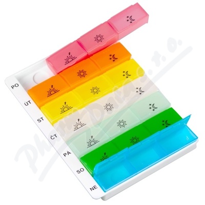 Slouží k přehlednému a spolehlivému dávkování léků doma i na cestách. Každý den má 3 přihrádky, které lze použít např. k dávkování ráno, v poledne a večer. Obsahuje jednoduché ikony značící denní dobu a znakové odlišení pro zdravotně postižené.Použití