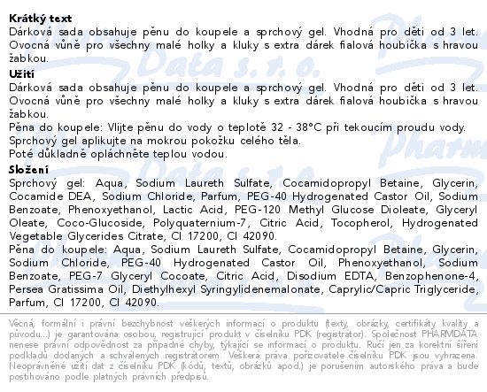 Dárková sada obsahuje pěnu do koupele a sprchový gel. Vhodná pro děti od 3 let. Ovocná vůně pro všechny malé holky a kluky s extra dárek fialová houbička s hravou žabkou.Použití