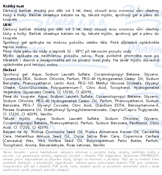 Dárkový balíček vhodný pro děti od 3 let, který okouzlí svou ovocnou vůní všechny kluky a holky. Balíček obsahuje balzám na rty, tekuté mýdlo, sprchový gel a pěnu do koupele.Použití
