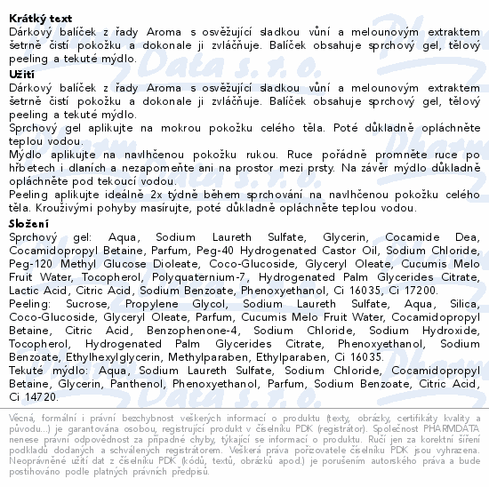 Dárkový balíček z řady Aroma s osvěžující sladkou vůní a melounovým extraktem šetrně čistí pokožku a dokonale ji zvláčňuje. Balíček obsahuje sprchový gel, tělový peeling a tekuté mýdlo.Použití