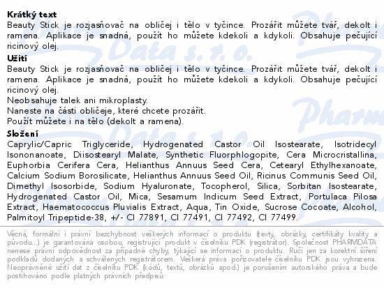 Beauty Stick je rozjasňovač na obličej i tělo v tyčince. Prozářit můžete tvář, dekolt i ramena. Aplikace je snadná, použít ho můžete kdekoli a kdykoli. Obsahuje pečující ricinový olej.Použití