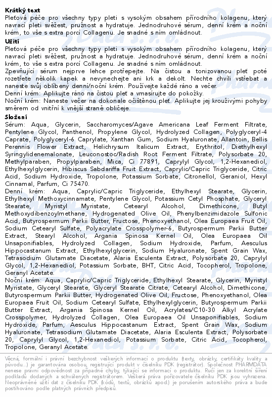 Pleťová péče pro všechny typy pleti s vysokým obsahem přírodního kolagenu, který navrací pleti svěžest, pružnost a hydratuje. Jednodruhové sérum, denní krém a noční krém, to vše s extra porcí Collagenu. Je snadné s ním omládnout.Použití