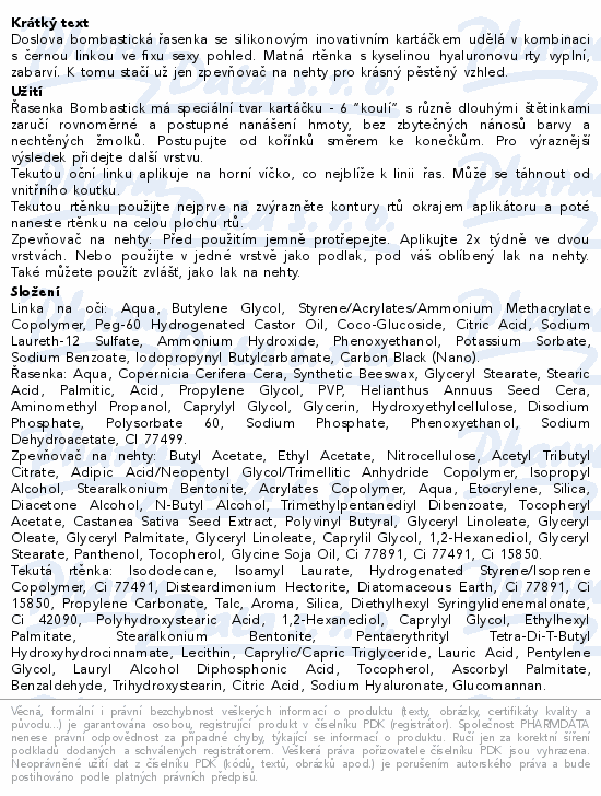 Doslova bombastická řasenka se silikonovým inovativním kartáčkem udělá v kombinaci s černou linkou ve fixu sexy pohled. Matná rtěnka s kyselinou hyaluronovu rty vyplní, zabarví. K tomu stačí už jen zpevňovač na nehty pro krásný pěstěný vzhled.Použití