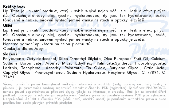 Lip Treat je unikátní produkt, který v sobě skrývá nejen péči, ale i lesk a efekt plných rtů. Obsahuje olivový olej, kyselinu hyaluronovou, rty jsou tak hydratované, lesklé, tónované a hebké, zároveň vyhladí jemné vrásky na rtech a opticky je zvětší.Použití