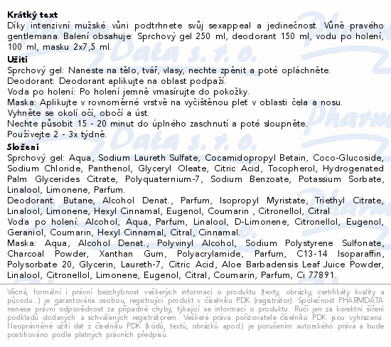 Díky intenzivní mužské vůni podtrhnete svůj sexappeal a jedinečnost. Vůně pravého gentlemana. Balení obsahuje: Sprchový gel 250 ml, deodorant 150 ml, vodu po holení, 100 ml, masku 2x7, 5 ml.Použití