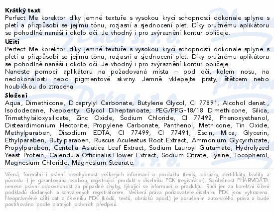 Perfect Me korektor díky jemné textuře s vysokou krycí schopností dokonale splyne s pletí a přizpůsobí se jejímu tónu, rozjasní a sjednocení pleť. Díky pružnému aplikátoru se pohodlně nanáší i okolo očí. Je vhodný i pro zvýraznění kontur obličeje.Použití