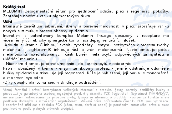 MELUMIN Depigmentační sérum pro sjednocení odstínu pleti a regeneraci pokožky. Zabraňuje novému vzniku pigmentových skvrn.Použití