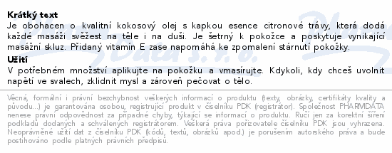 Je obohacen o kvalitní kokosový olej s kapkou esence citronové trávy, která dodá každé masáži svěžest na těle i na duši. Je šetrný k pokožce a poskytuje vynikající masážní skluz. Přidaný vitamín E zase napomáhá ke zpomalení stárnutí pokožky.Použití
