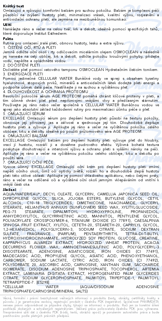 Omlazující a vyživující komfortní balzám pro suchou pokožku. Balzám je komplexní péčí působící na zvýšení hustoty pleti, minimalizaci vrásek, kvalitní výživu, rozjasnění a antioxidační ochranu pleti, ale zejména na mezibuněčnou komunikaci.Použití