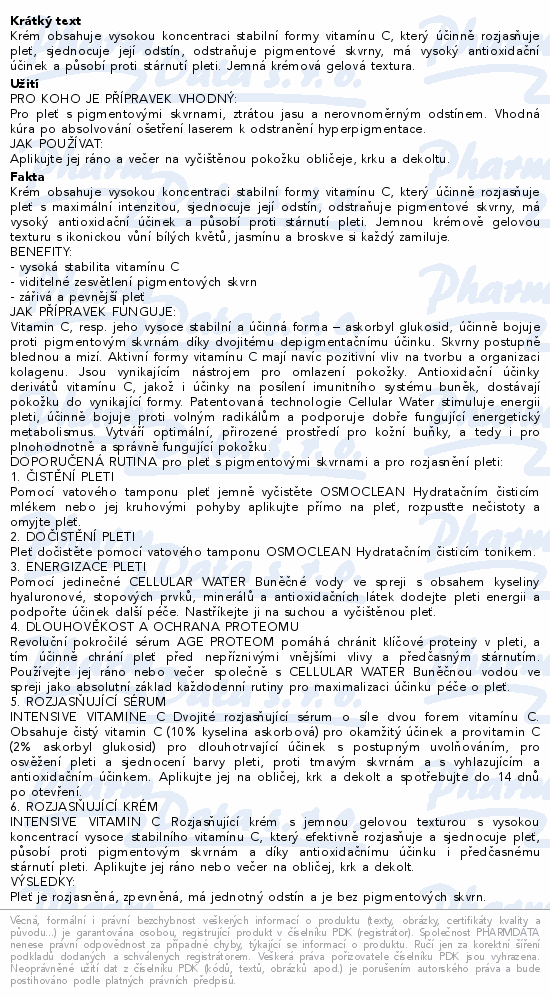 Krém obsahuje vysokou koncentraci stabilní formy vitamínu C, který účinně rozjasňuje pleť, sjednocuje její odstín, odstraňuje pigmentové skvrny, má vysoký antioxidační účinek a působí proti stárnutí pleti. Jemná krémová gelová textura.Použití