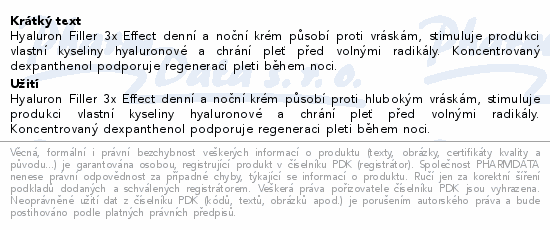 Hyaluron Filler 3x Effect denní a noční krém působí proti vráskám, stimuluje produkci vlastní kyseliny hyaluronové a chrání pleť před volnými radikály. Koncentrovaný dexpanthenol podporuje regeneraci pleti během noci.Použití