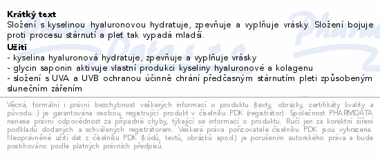 Složení s kyselinou hyaluronovou hydratuje, zpevňuje a vyplňuje vrásky. Složení bojuje proti procesu stárnutí a pleť tak vypadá mladší.Použití