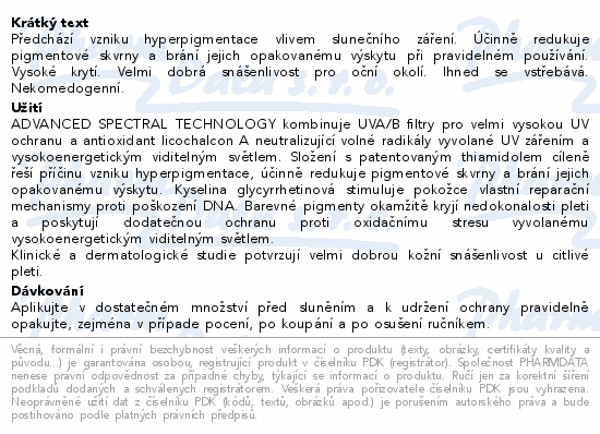 Předchází vzniku hyperpigmentace vlivem slunečního záření. Účinně redukuje pigmentové skvrny a brání jejich opakovanému výskytu při pravidelném používání. Vysoké krytí. Velmi dobrá snášenlivost pro oční okolí. Ihned se vstřebává. Nekomedogenní.Použití