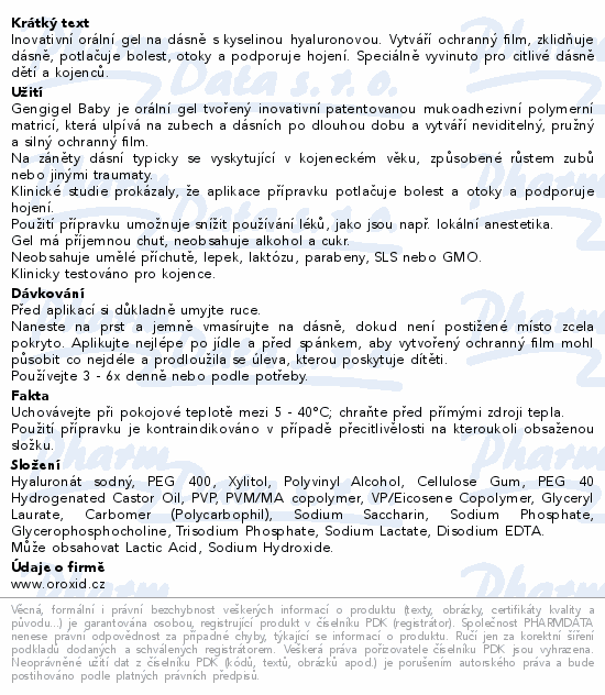 Inovativní orální gel na dásně s kyselinou hyaluronovou. Vytváří ochranný film, zklidňuje dásně, potlačuje bolest, otoky a podporuje hojení. Speciálně vyvinuto pro citlivé dásně dětí a kojenců.Použití