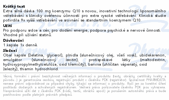 Extra silná dávka 100 mg koenzymu Q10 s novou, inovativní technologií liposomálního vstřebávání s klinicky ověřenou účinností pro extra vysoké vstřebávání. Klinická studie potvrdila 9x vyšší vstřebávání ve srovnání se standartním koenzymem Q10.Použití