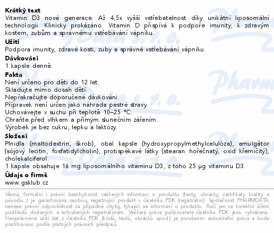 Vitamin D3 nové generace. Až 4, 5x vyšší vstřebatelnost díky unikátní liposomální technologii. Klinicky prokázáno. Vitamin D přispívá k podpoře imunity, k zdravým kostem, zubům a správnému vstřebávání vápníku.Použití