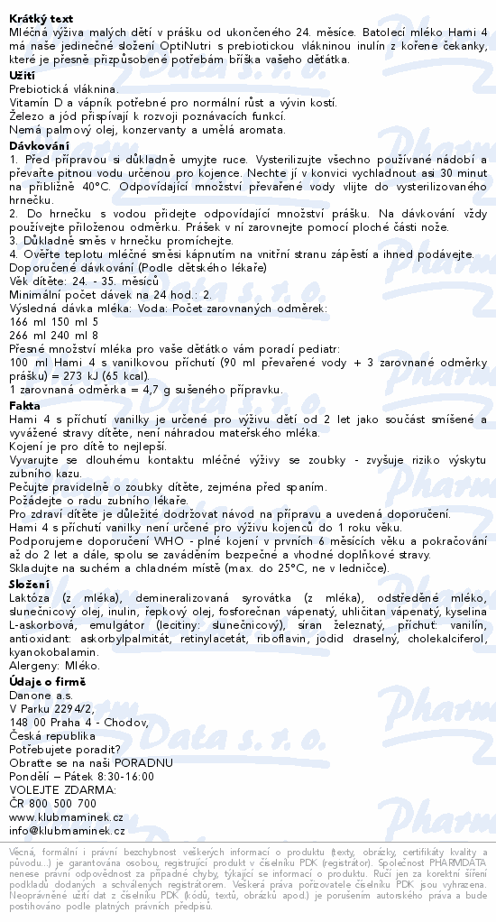 Mléčná výživa malých dětí v prášku od ukončeného 24. měsíce. Batolecí mléko Hami 4 má naše jedinečné složení OptiNutri s prebiotickou vlákninou inulín z kořene čekanky, které je přesně přizpůsobené potřebám bříška vašeho děťátka.Použití