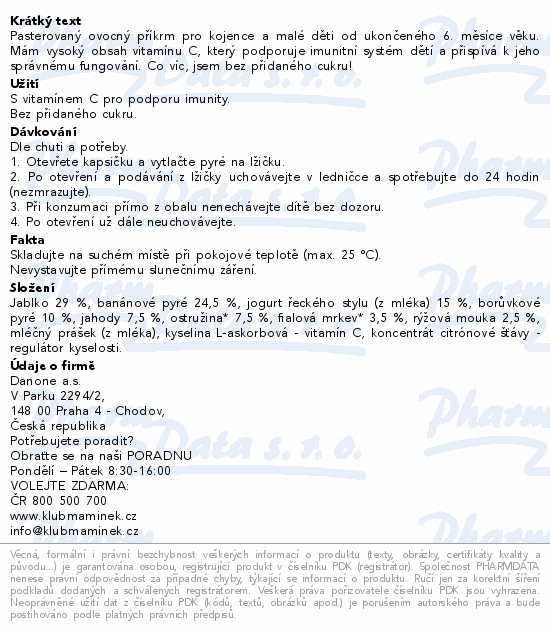 Pasterovaný ovocný příkrm pro kojence a malé děti od ukončeného 6. měsíce věku. Mám vysoký obsah vitamínu C, který podporuje imunitní systém dětí a přispívá k jeho správnému fungování. Co víc, jsem bez přidaného cukru!Použití